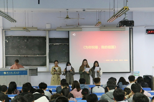 一次诗歌朗诵大赛,激发责任担当。学院组织开展以“庆七十年华诞,我与祖国共奋进”为主题的诗歌朗诵大赛,结合配乐、图片、视频等形式,讲述对国家、学校的情感。从而进一步激发学生爱国爱校的情感,树立责任意识和使命意识,争做一名有责任感、有担当精神的大学生。
