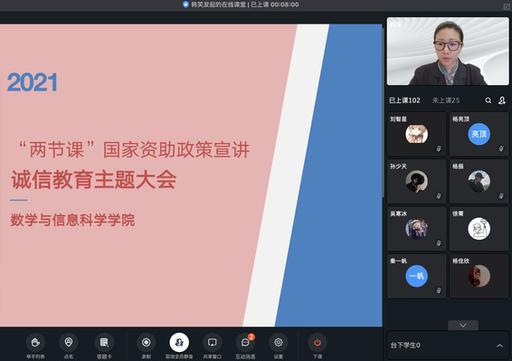 为全面宣传党和国家的学生资助政策,充分发挥资助育人功能,增强当代大学生的诚信意识和责任意识,9月10日mx动漫 在线上钉钉平台召开资助知识宣讲“两节课”活动,负责资助工作的专职教师韩笑及全体2021级新生参加会议。