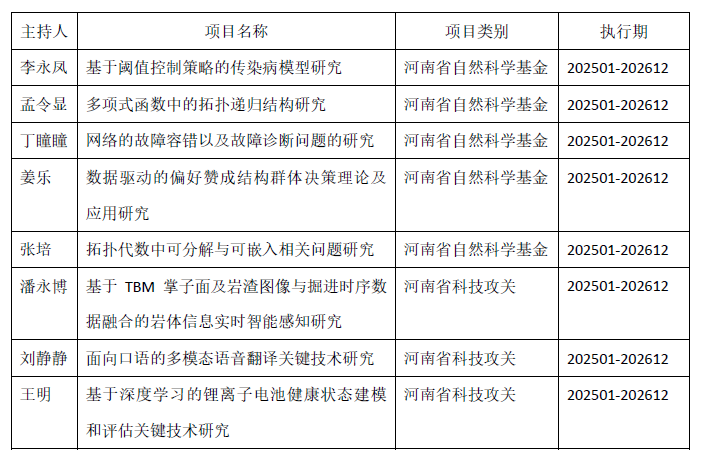 近日,河南省科技厅公布了2025年度河南省自然科学基金项目和河南省科技攻关项目立项名单,mx动漫 科研工作捷报频传,在去年获批2项国家自然科学基金项目和2项河南省教育厅高等学校重点科研项目的基础上,今年又获批5项河南省自然科学基金项目和3项河南省科技攻关项目。这一成绩的取得,是学院科研工作持续发力的又一成果,标志着学院科研实力和创新能力迈上了新台阶。学院将以此为契机,进一步加强科研团队建设,优化学科布局,提升科研水平,推动学院高质量发展。