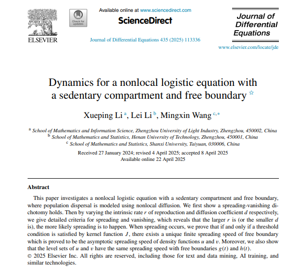 近日,mx动漫 李雪平博士在数学领域国际知名学术期刊《Journal of Differential Equations》(中科院一区TOP)上发表题为 “Dynamics for a nonlocal logistic equation with a sedentary compartment and free boundary(具有定居种群组分和自由边界的非局部logistic方程的动力学行为)”的研究论文。该成果以mx动漫 为第一署名单位,李雪平博士为第一作者,与河南工业大学李磊博士、山西大学王明新教授共同合作完成。