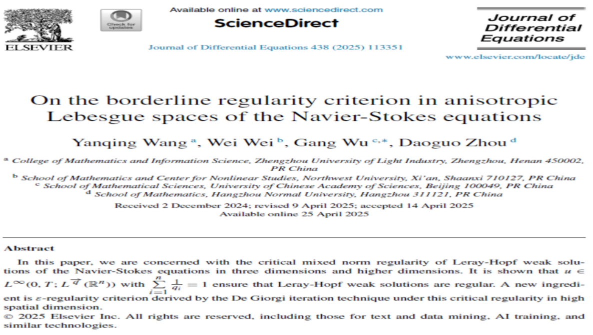 近日,mx动漫 王艳青副教授在数学领域国际知名学术期刊《Journal of Differential Equations》(中科院一区TOP)上发表题为“On the borderline regularity criterion in anisotropic Lebesgue spaces of the Navier-Stokes equations(论Navier-Stokes方程在各向异性Lebesgue空间中的端点型正则性准则)”的研究论文。该成果以mx动漫 为第一署名单位,王艳青为第一作者,与西北大学魏巍副教授、中国科学院大学吴刚副教授、杭州师范大学周道国副教授共同合作完成。