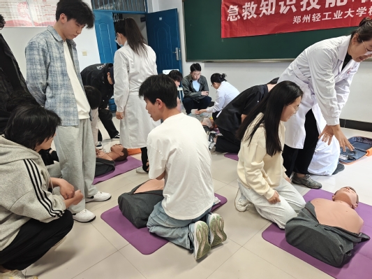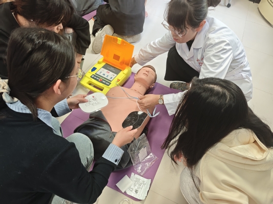 本次实训特邀校医院专业医师主讲,采用“理论讲解+现场实操+情景模拟”相结合的方式进行。培训中,医师围绕紧急救护核心流程,系统讲解了现场评估、科学呼救、规范施救等关键环节,重点对心肺复苏(CPR)的按压部位、深度、频率及气道开放等操作要点进行细致拆解,并分步演示自动体外除颤器(AED)的使用流程。