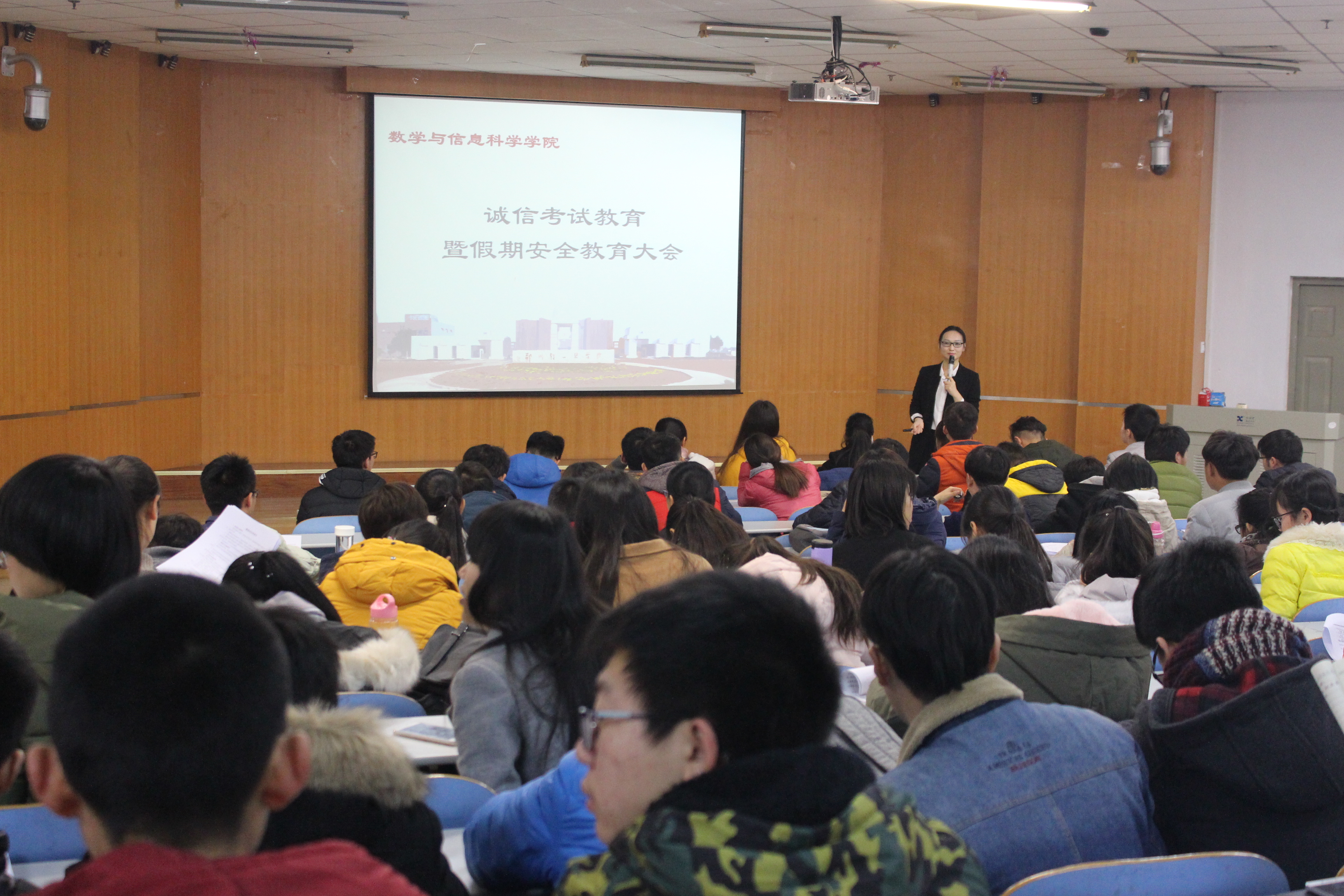 晚上19:30,全体16级学生在教三楼103开展期末考试动员暨寒假安全教育大会,辅导员石庆庆老师给大家讲了期末考试的有关注意事项,叮嘱大家认真对待大学的第一次考试,认真复习,争取取得好成绩,接下来从人身安全、防火安全、防盗防骗等方面向同学们讲解了假期安全的相关注意事项。并让大家签订诚信考试承诺书和寒假安全承诺书,并统计了学生寒假的去向。