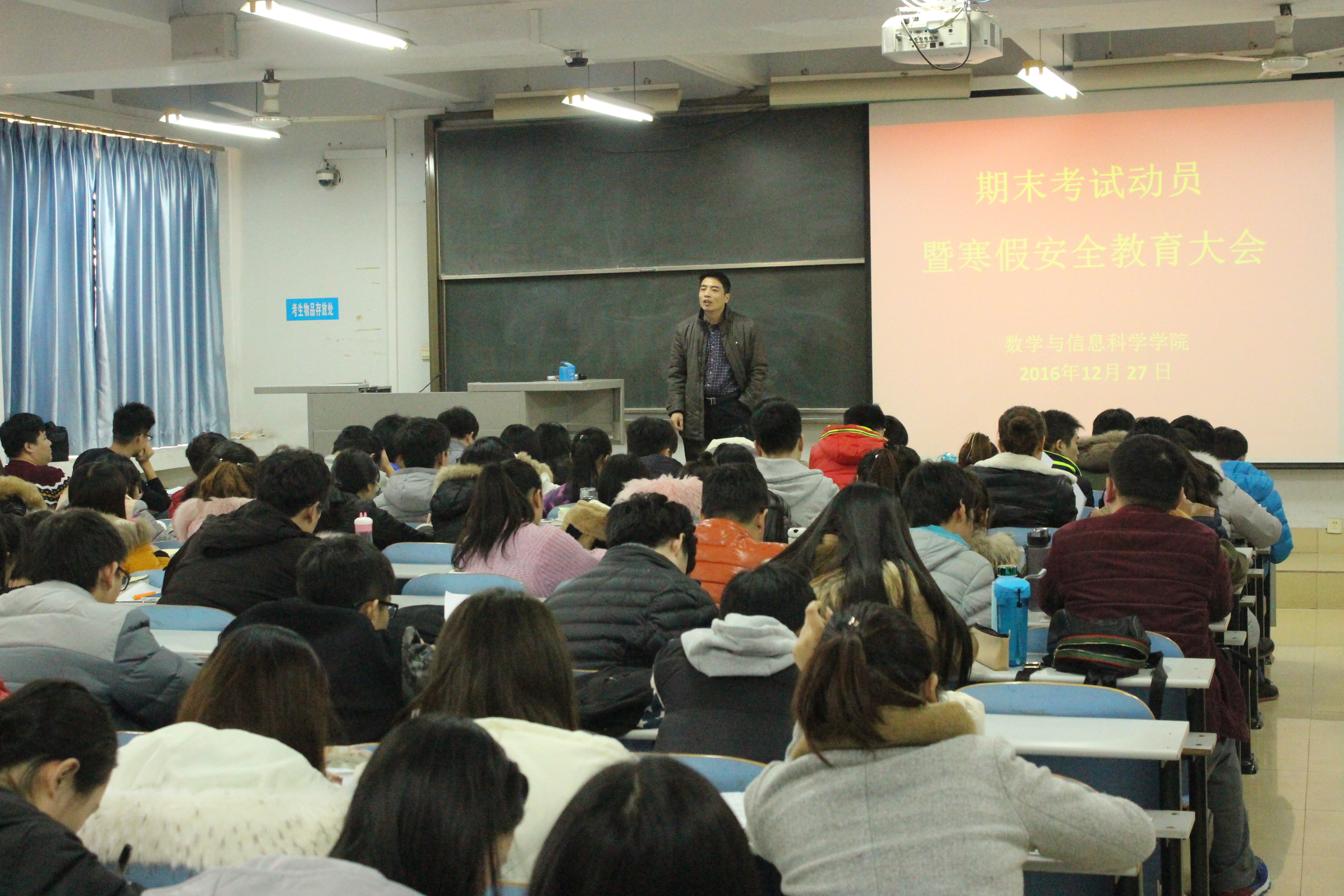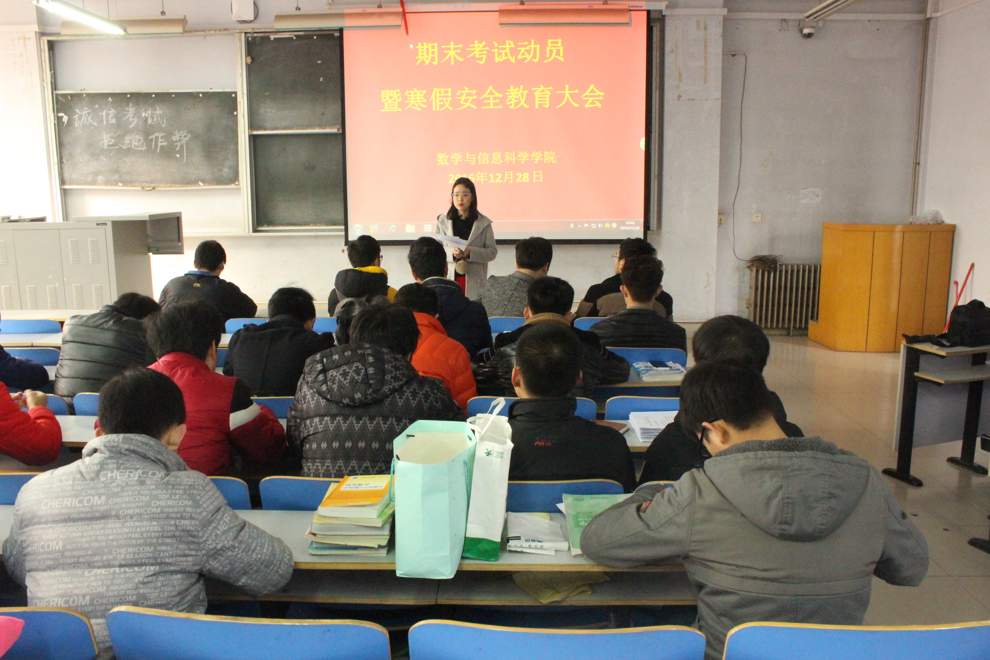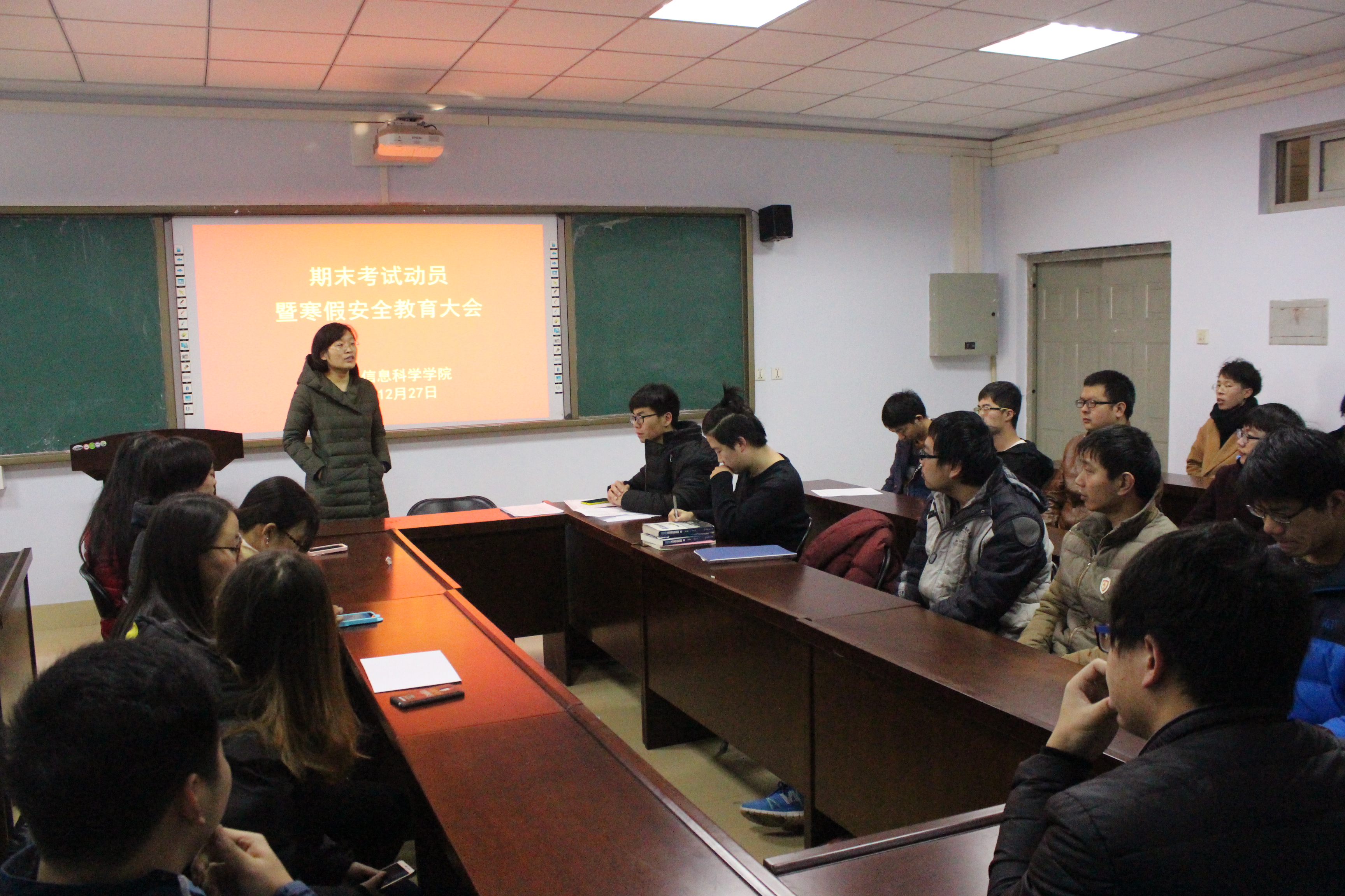 中午12:00,应数14-01班班主任齐静老师召开了班会,总结了一学期来班级的各项情况,并要求学生认真对待即将到来的课程设计,又对学生寒假安全问题进行了叮嘱。28日上午10:30,辅导员张文卿老师对信科14-01班进行了期末考试动员和寒假安全教育,要求同学们高度重视安全防范工作,确保人身财产安全。