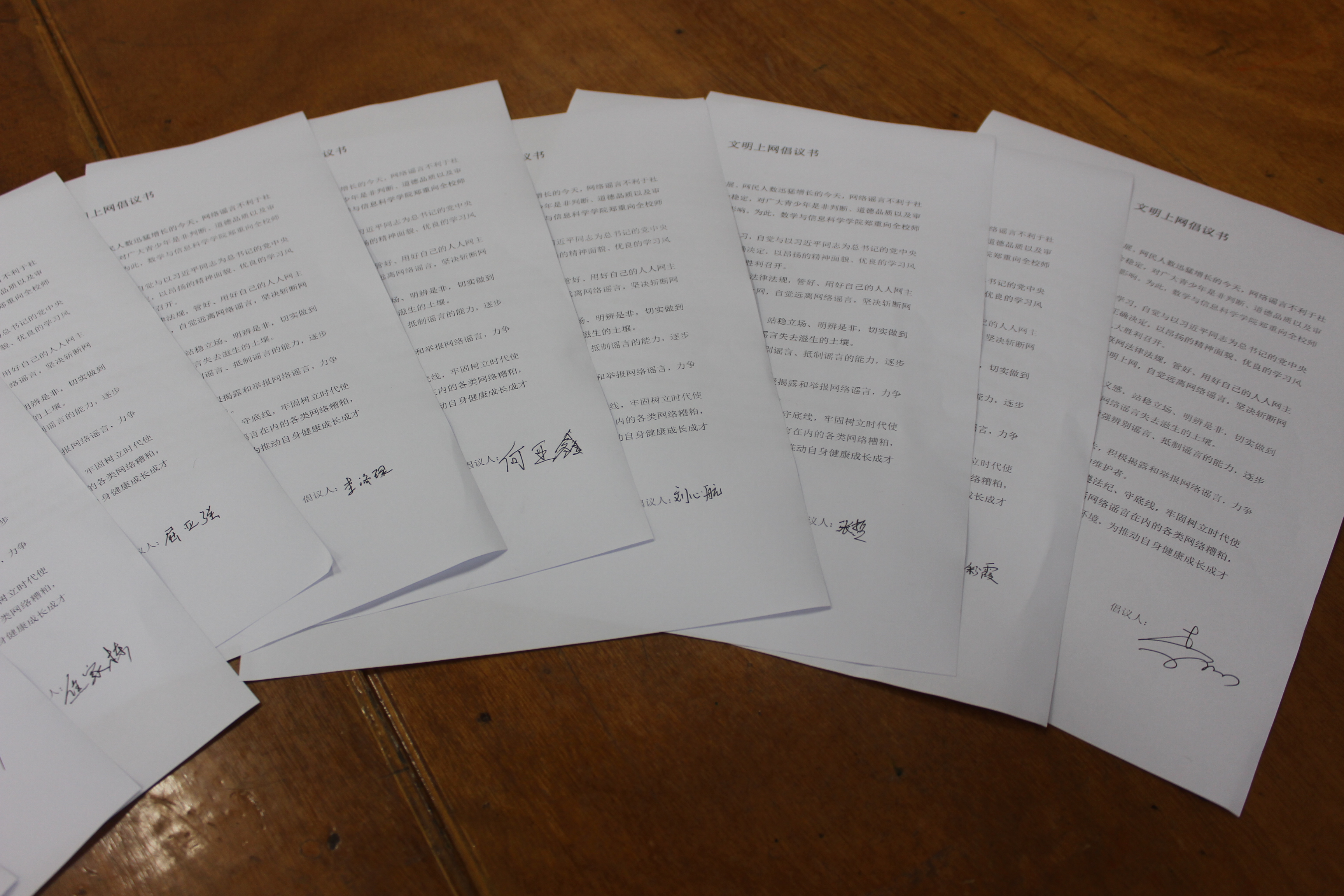 活动开始前,院学生会成员们提前来到主干道为开展活动做准备。活动伊始,吸引了众多同学前来观看。成员们热情地向同学们介绍本次活动的内容及意义,大家均表示受益匪浅。随后,成员们还邀请广大同学在文明倡议书上签字,以此来表达自己对于文明上网的支持。